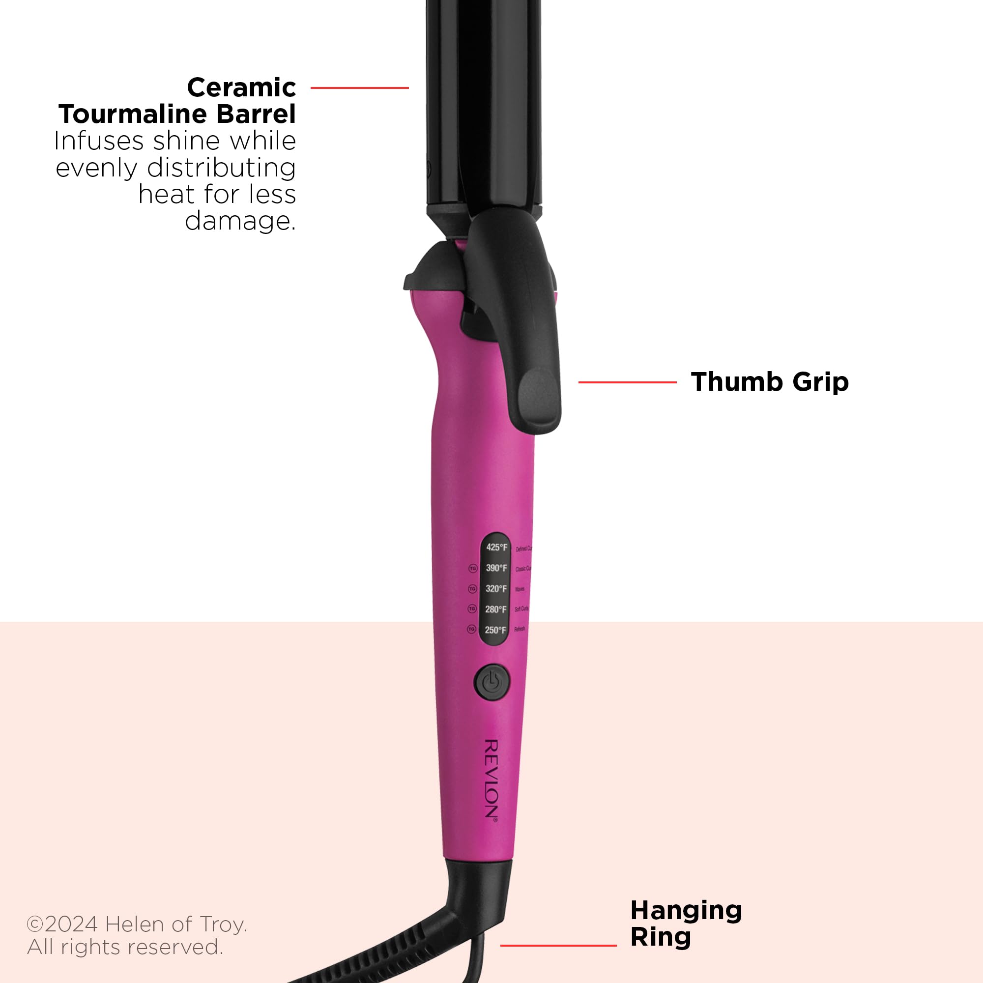 - Ceramic Tourmaline Barrel: Infuses shine while evenly distributing heat for less damage.