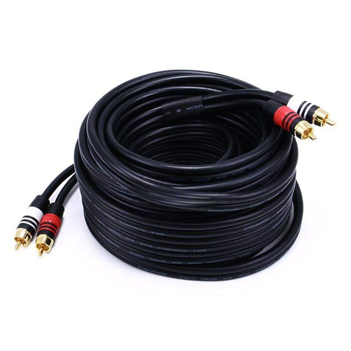 This is a premium two-channel audio cable made of RG-59 75 ohm coaxial cable. The cable uses a 22AWG conductor and is shielded to prevent EMI or RFI interference from entering your audio system. The connectors are gold plated, for smooth connections and to prevent corrosion. Each connector head features embedded, color-coded rubber rings to ensure a firm grip when installing or removing the cable.