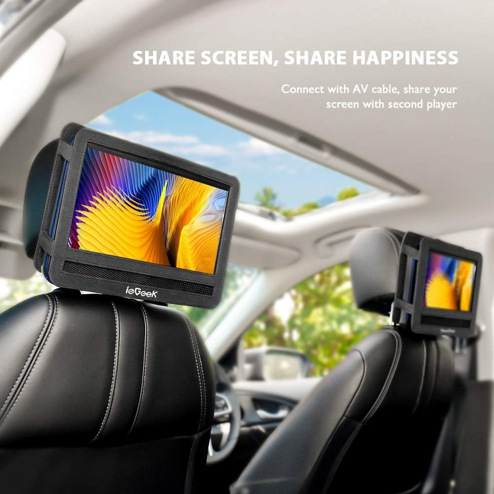 - 👨👩👧 Portable and Magical ---- Compact design makes it easy to carry out with you. Take it on your road trip, be companioned by your child, brings tons of fun for your journey. ieGeek DVD player can be easily swiveled as a tablet and mounted to the car headrest.